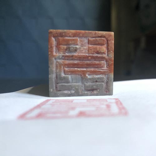 Ritkán vállalok pecsétfaragást. Ennek számtalan oka van, de legfőképpen az, hogy a pecsétfaragás művészete egy külön mesterség. A kalligráfusok gyakran elkészítik a saját pecsétjeiket, ez a régi korokban, hagyományosan is így volt, így névpecsétjeim közül több is saját készítésű. Ennek ellenére tavaly elvállaltam egy pecsét faragását, amelyet Edomoji stílusban készítettem el a magyar név japán jelentésével: otoko – férfi.